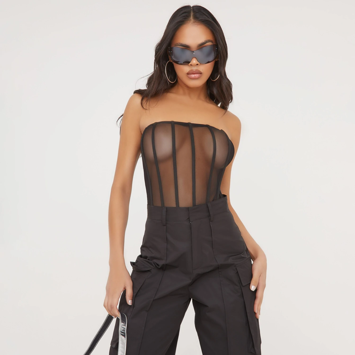 Amp up your weekend vibe with this bodysuit doll. Featuring a bandeau neckline, boning detail and a black mesh material. Team this with he matching cargos and heels for a vibe you can’t go wrong with.