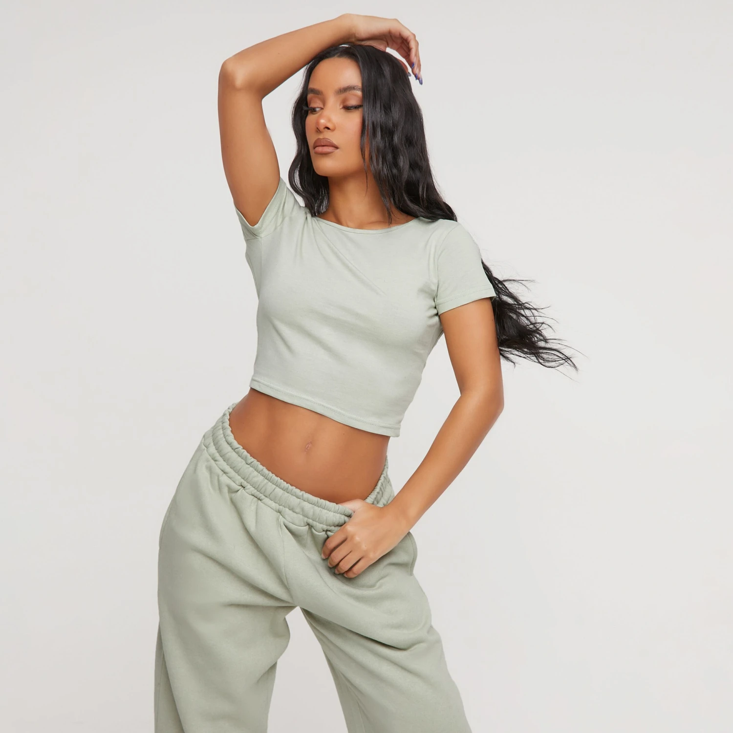 This t-shirt is perfect for those off duty days. Featuring a sage green material, a crew neck and a backless design. Team this with the matching hue joggers and fresh kicks for a cool girl look we love.