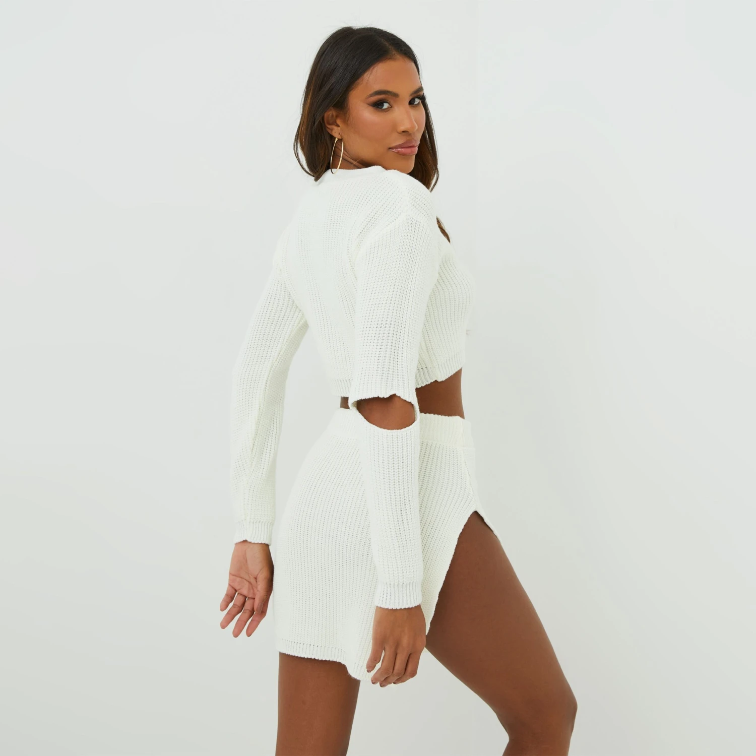 EGO Cut Out Sleeve Detail Cropped Jumper In Ivory Knit