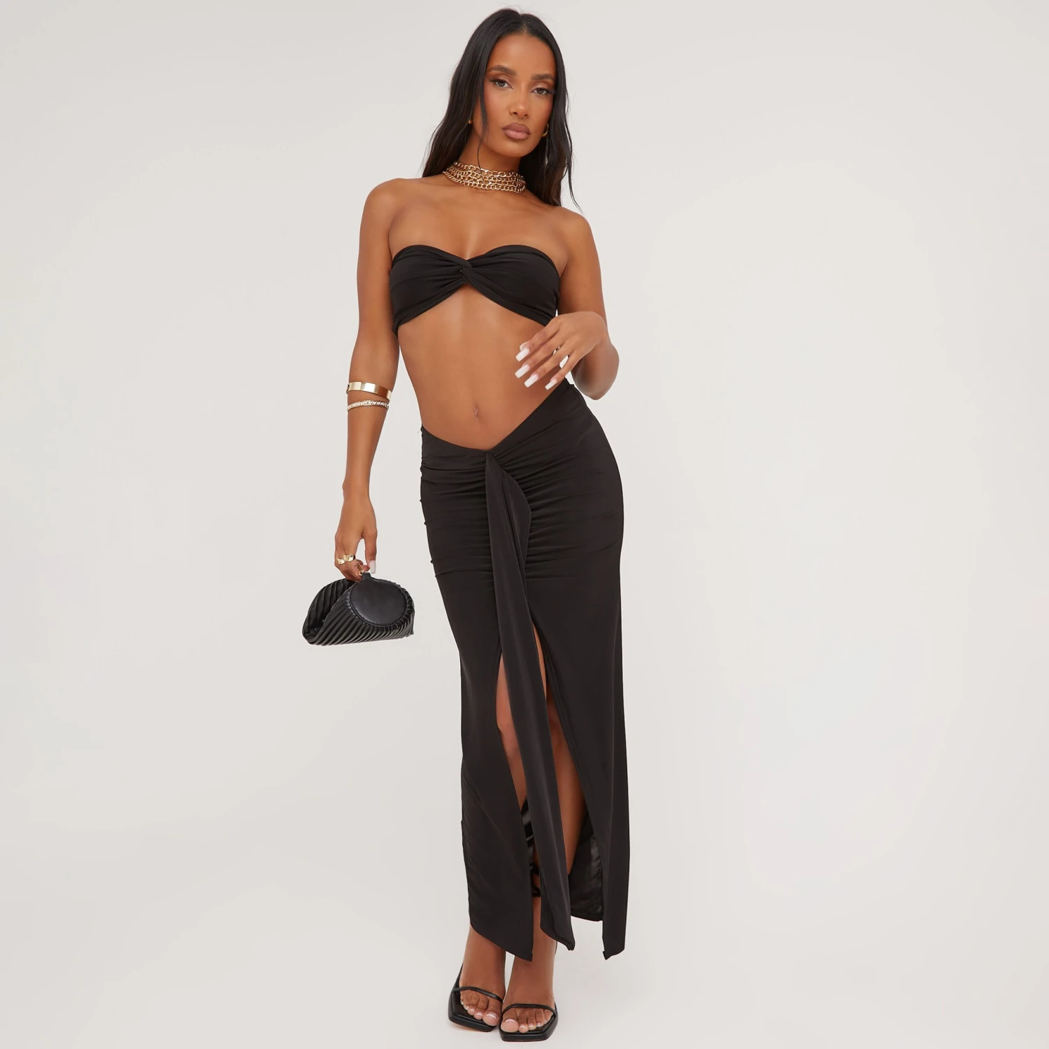 EGO Dipped Waist Knot Drape Detail Maxi Skirt In Black Slinky
