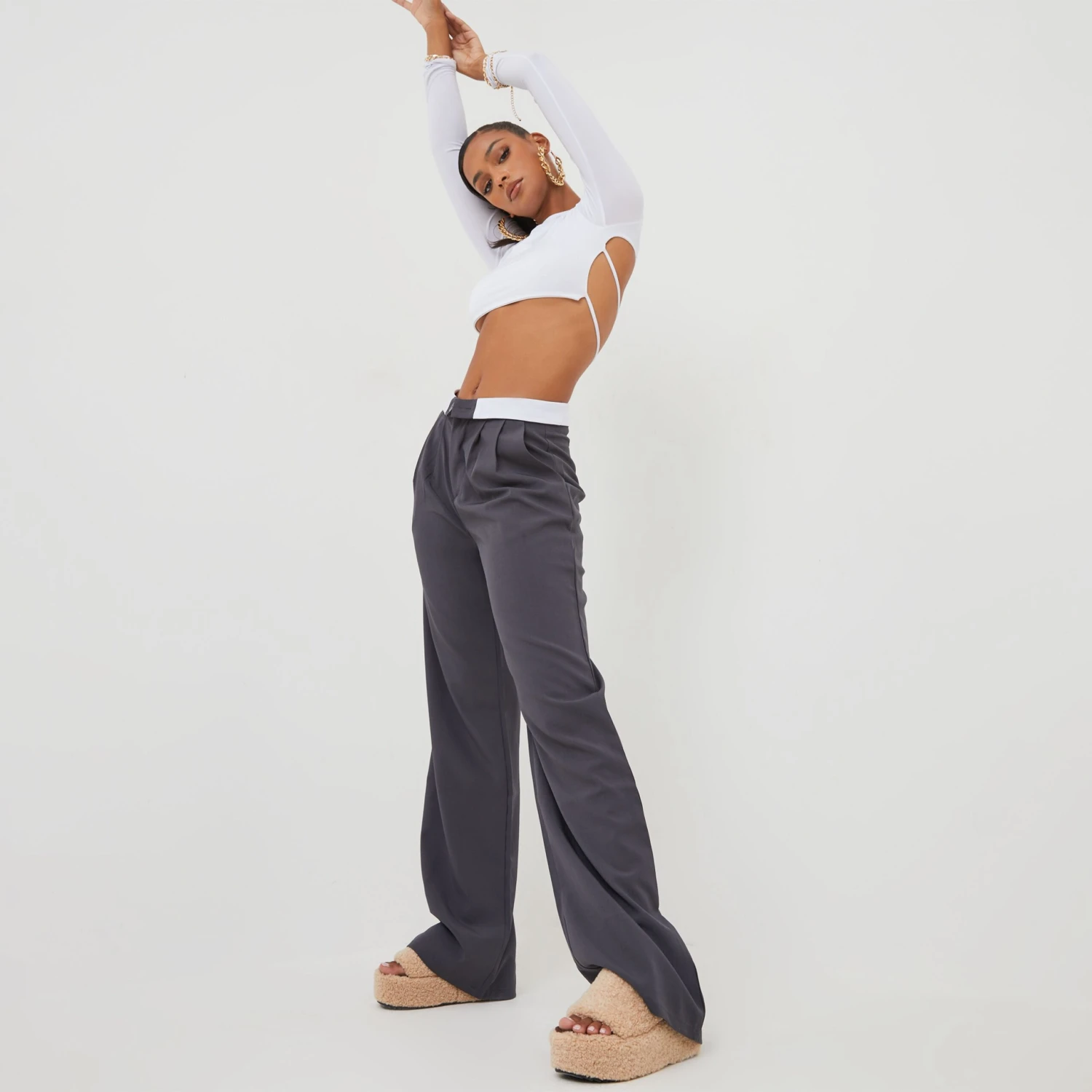EGO Fold Over High Waist Wide Leg Trousers In Charcoal