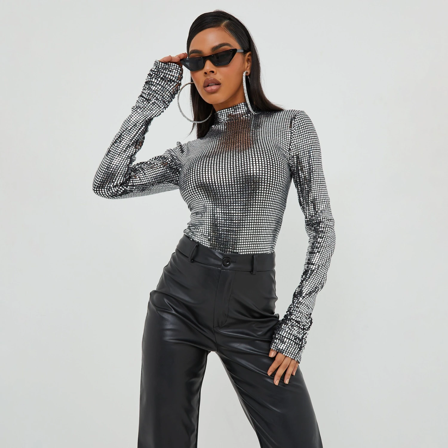 New EGO just dropped and we can’t get enough. Featuring a silver sequin material, a high neck, long sleeves and a bodysuit fit. Team this with some faux leather bottoms and heels to complete the look.