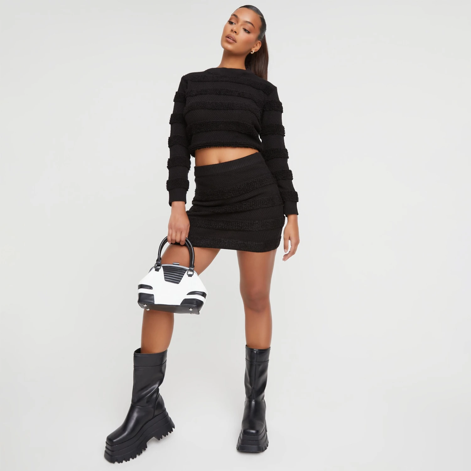 This top is heading straight in our basket doll. Featuring a black knit material, bubble detailing and a cropped length. Team this with the matching skirt and boots for an insta worthy look.