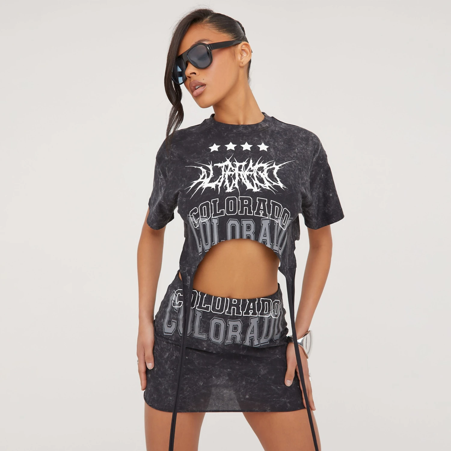 EGO High Waist ‘Colorado’ Graphic Print Mini Bodycon Skirt In Charcoal Acid Wash