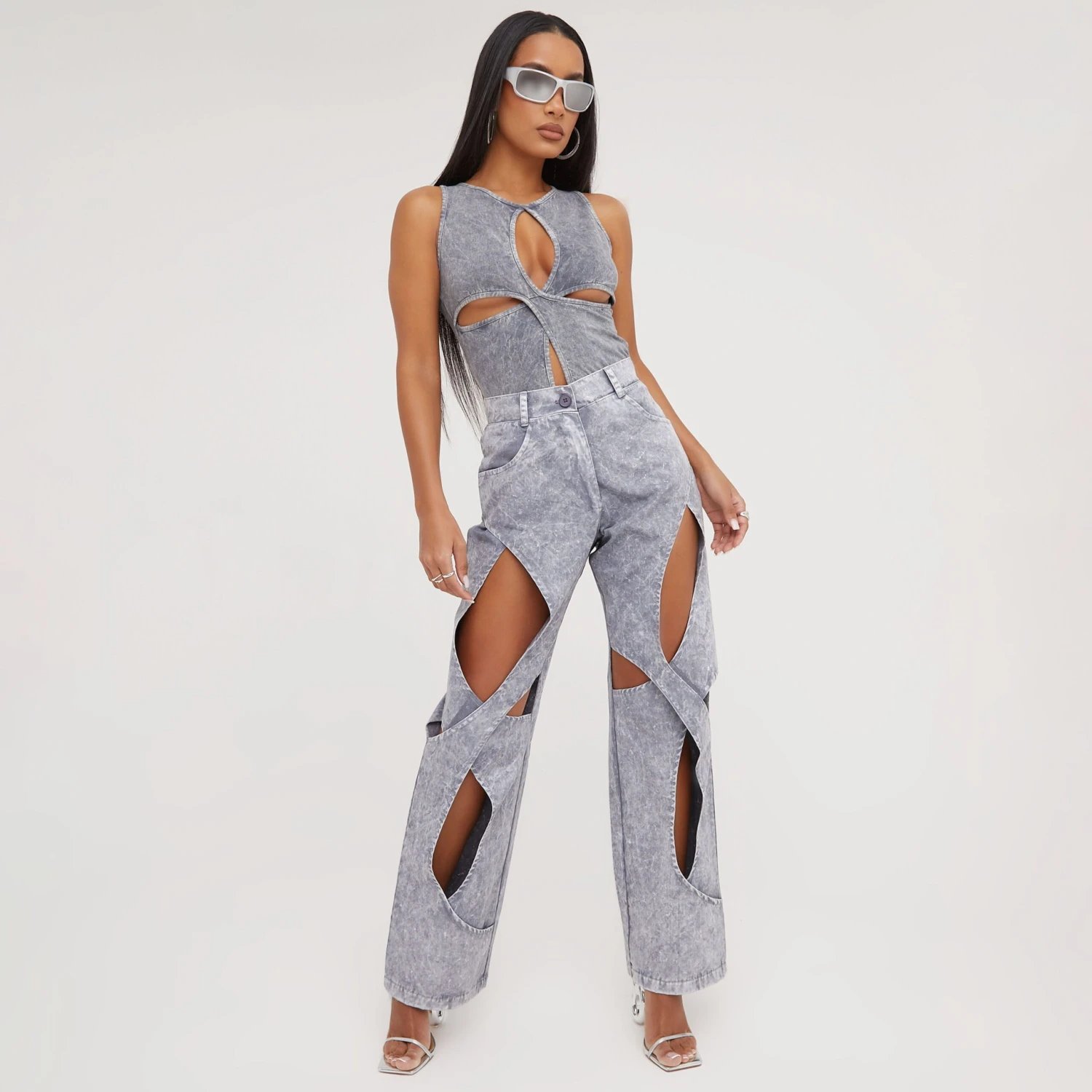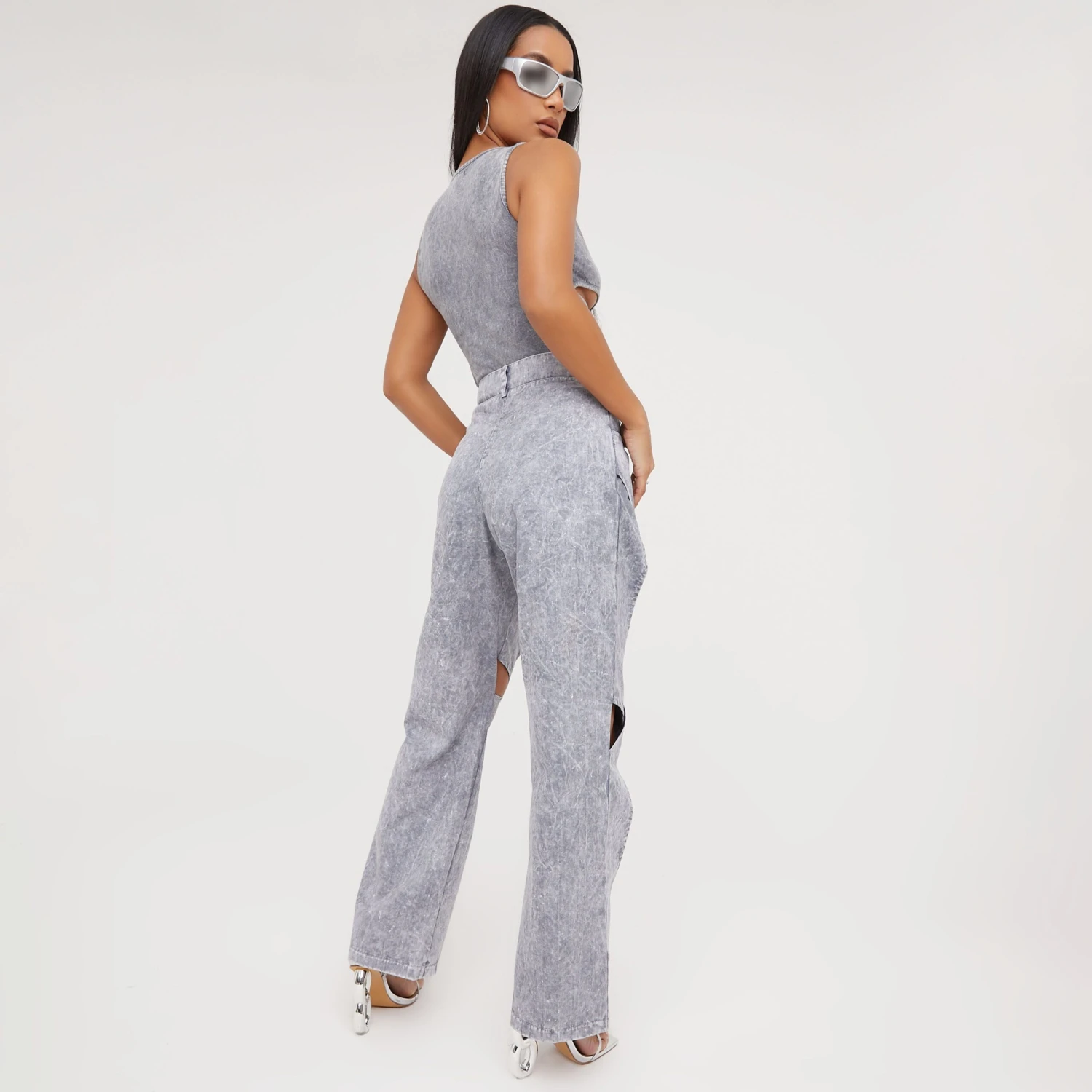 EGO High Waist Cross Cut Out Detail Straight Leg Trousers In Grey Acid Wash