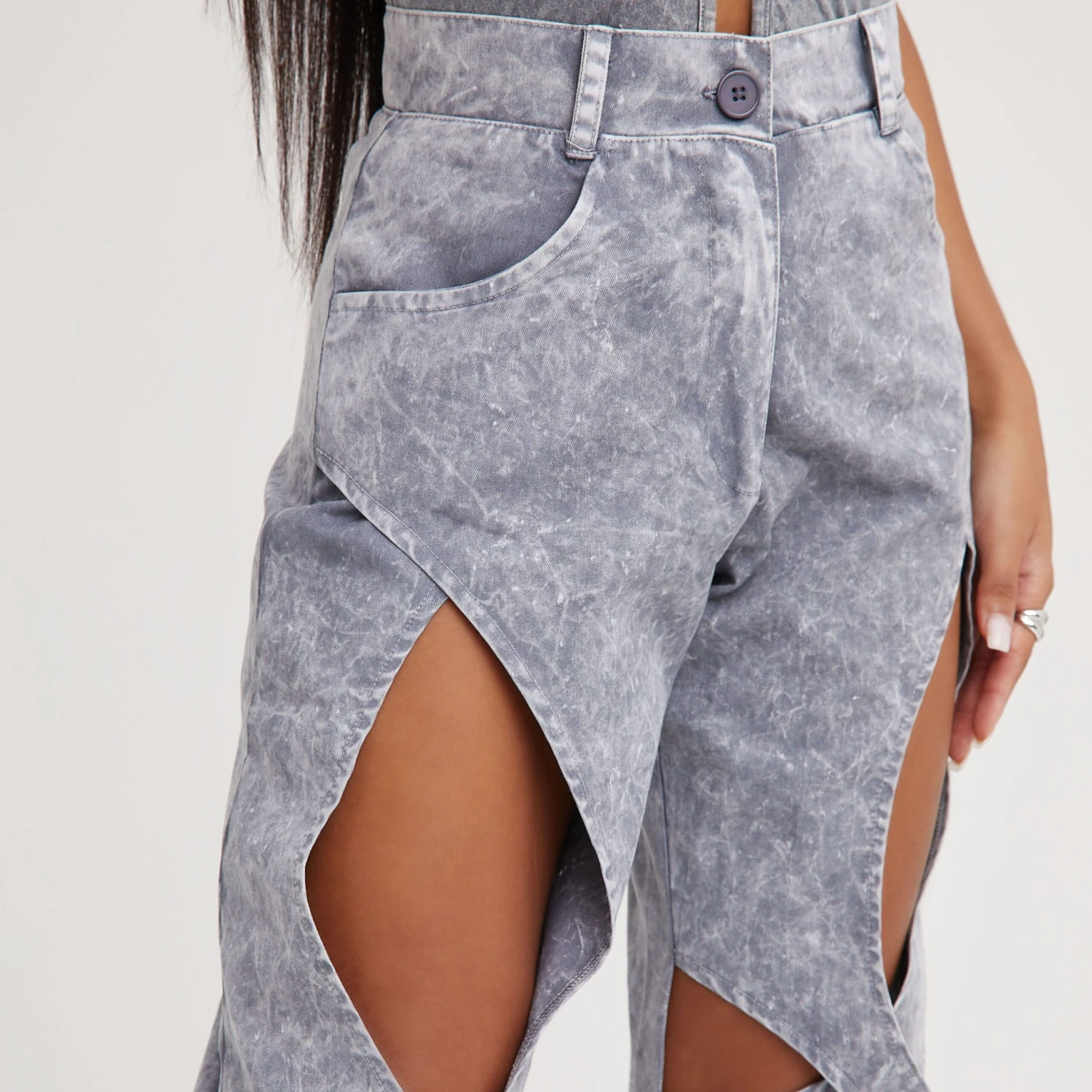 Be the first to review “EGO High Waist Cross Cut Out Detail Straight Leg Trousers In Grey Acid Wash” Cancel reply