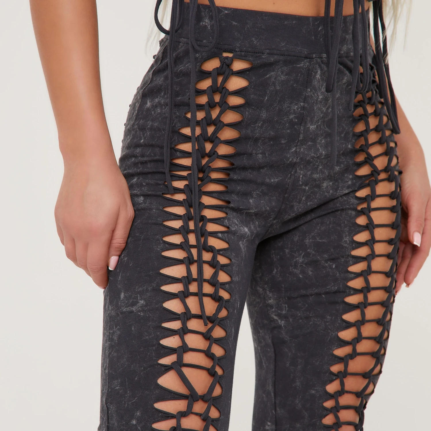 Girl, make a bold entrance in these statement trousers. Featuring a black acid material, with extreme ladder detailing, a high waist and a legging design.