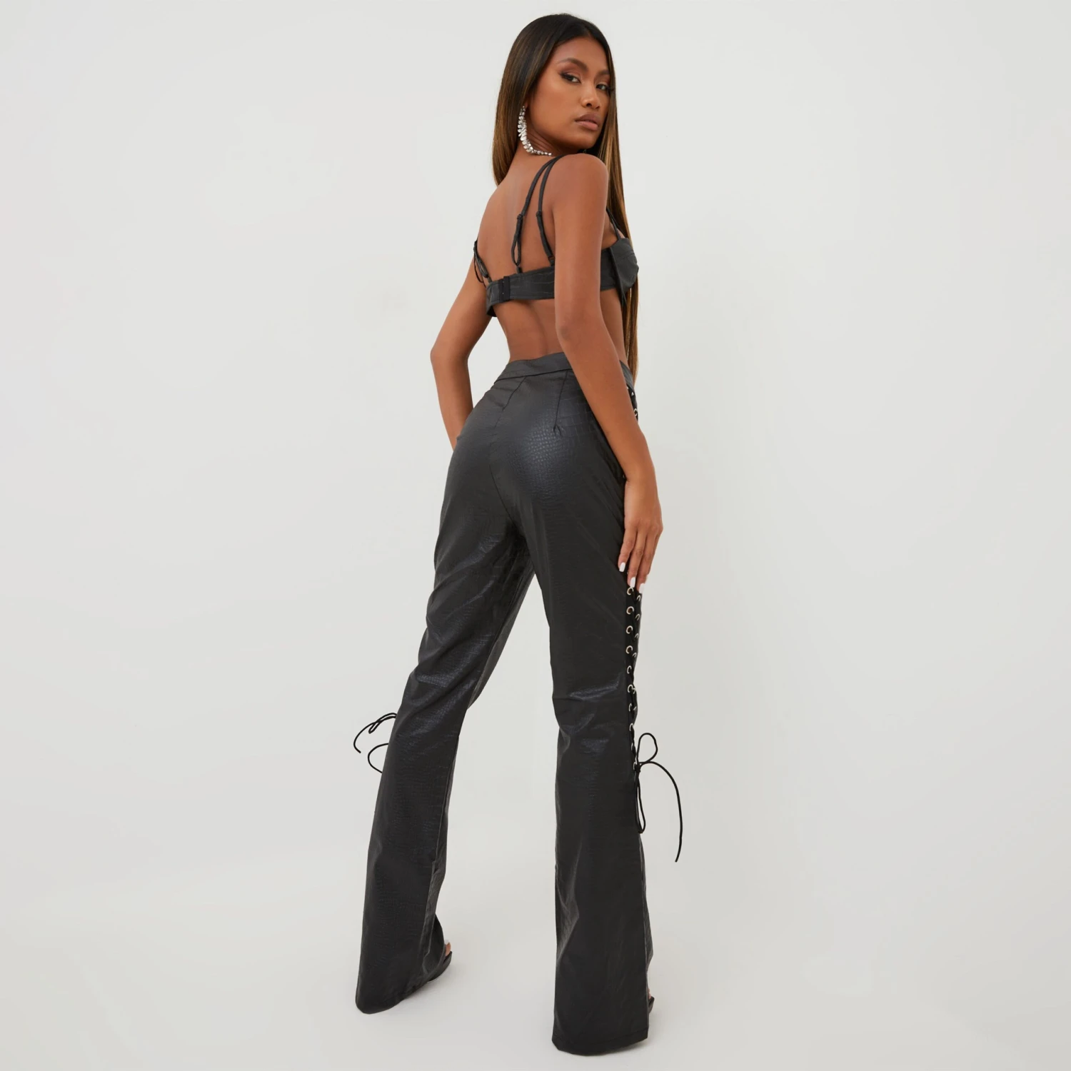 EGO High Waist Lace Up Side Detail Straight Leg Trousers In Black Croc Print Faux Leather