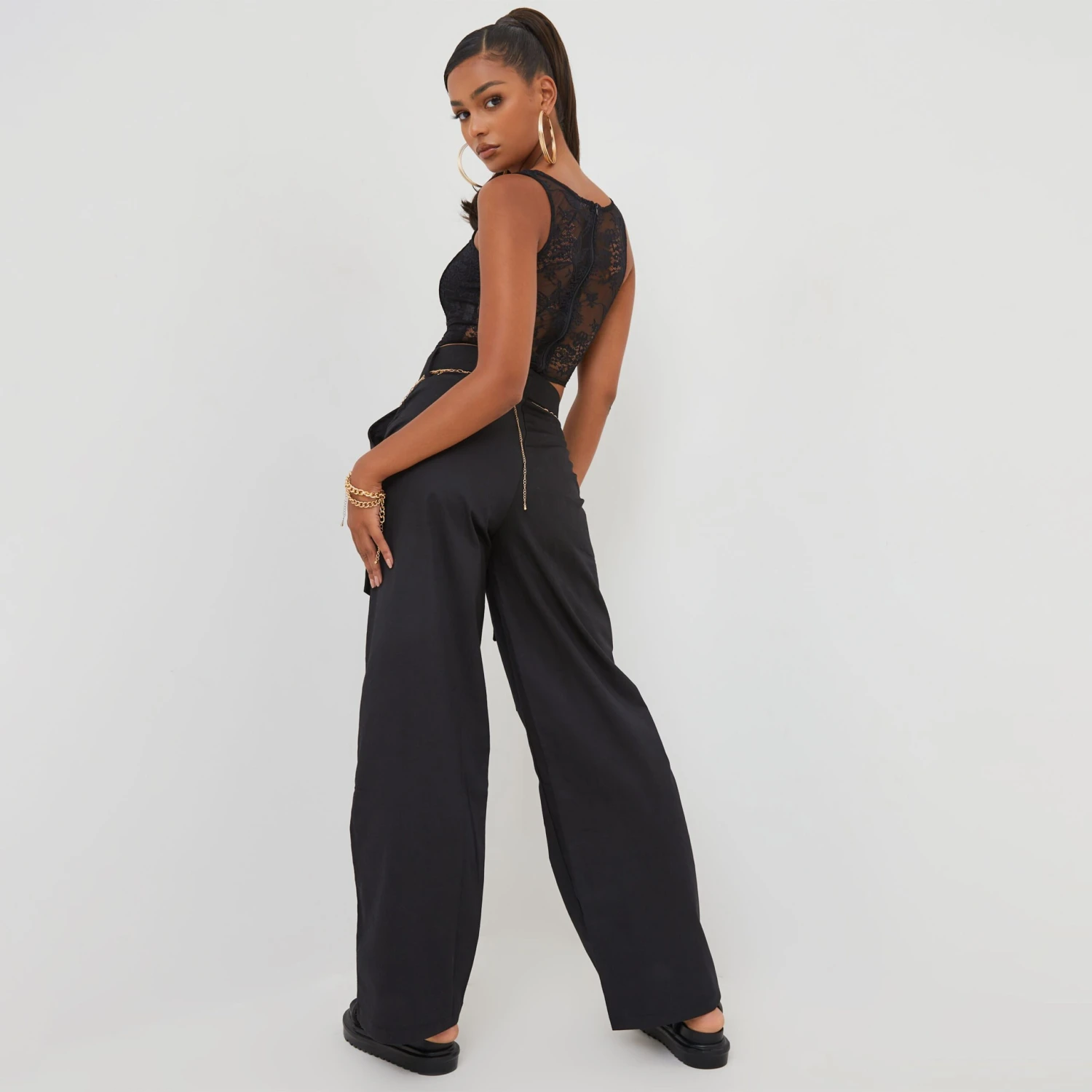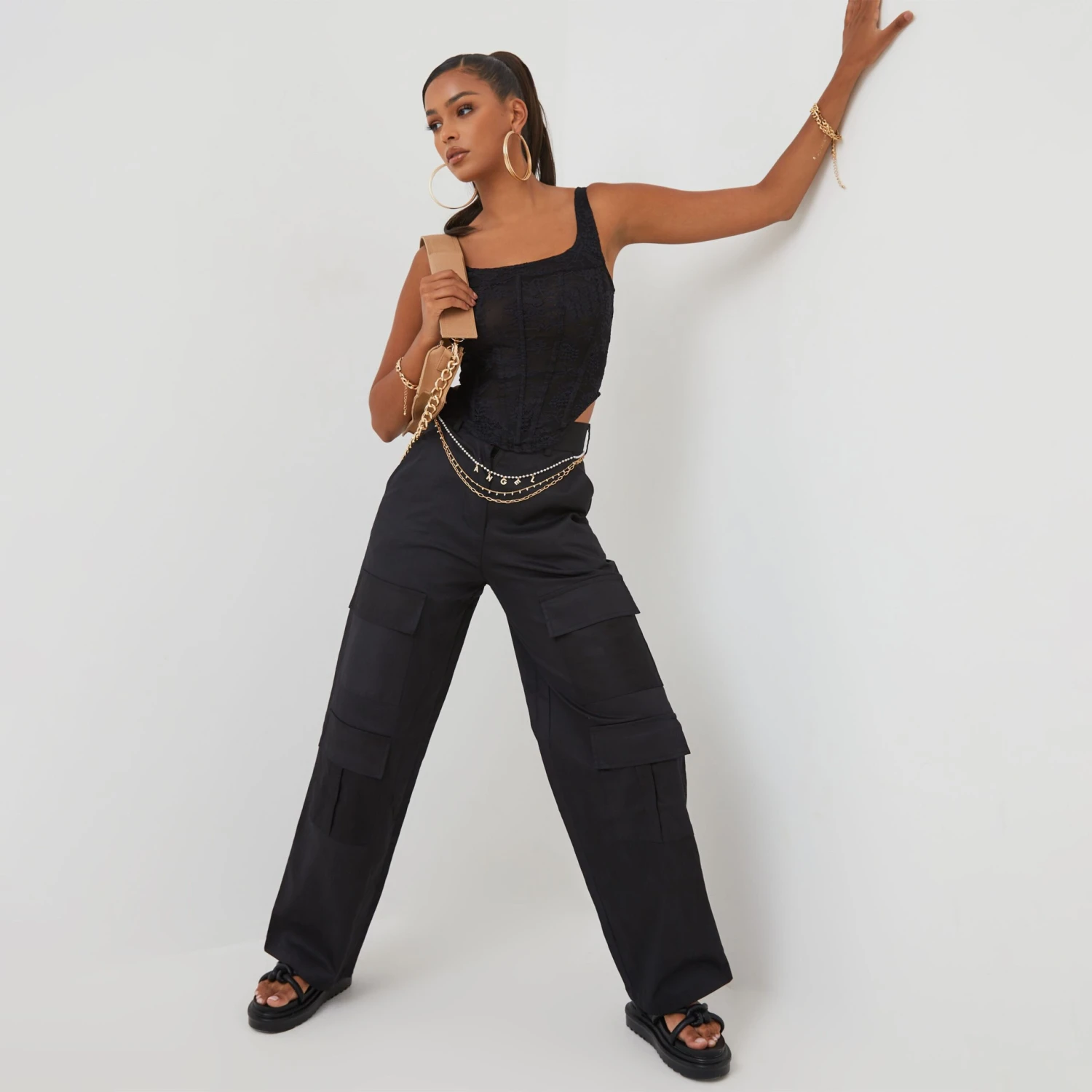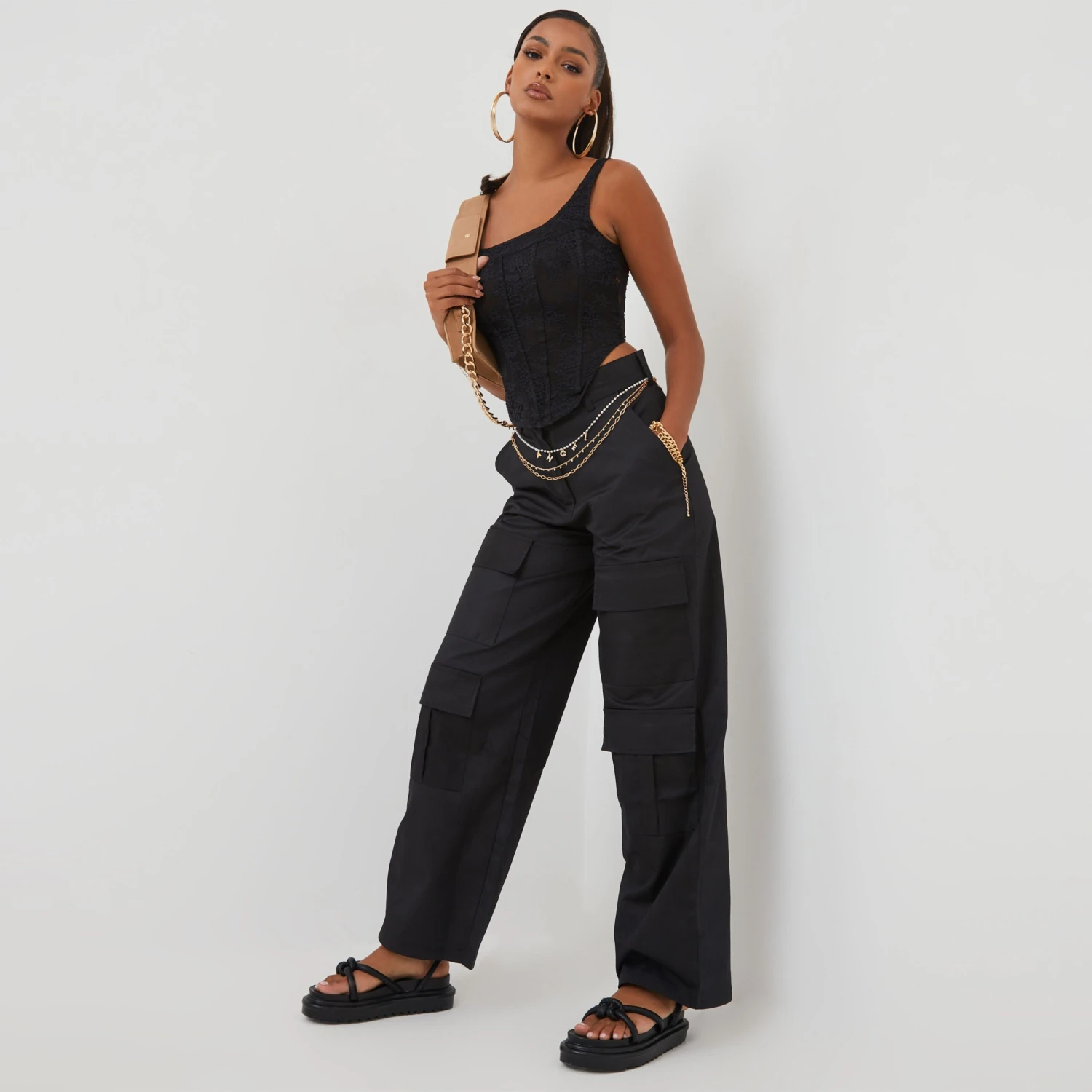 EGO High Waist Multi Pocket Detail Wide Leg Cargo Trousers In Black