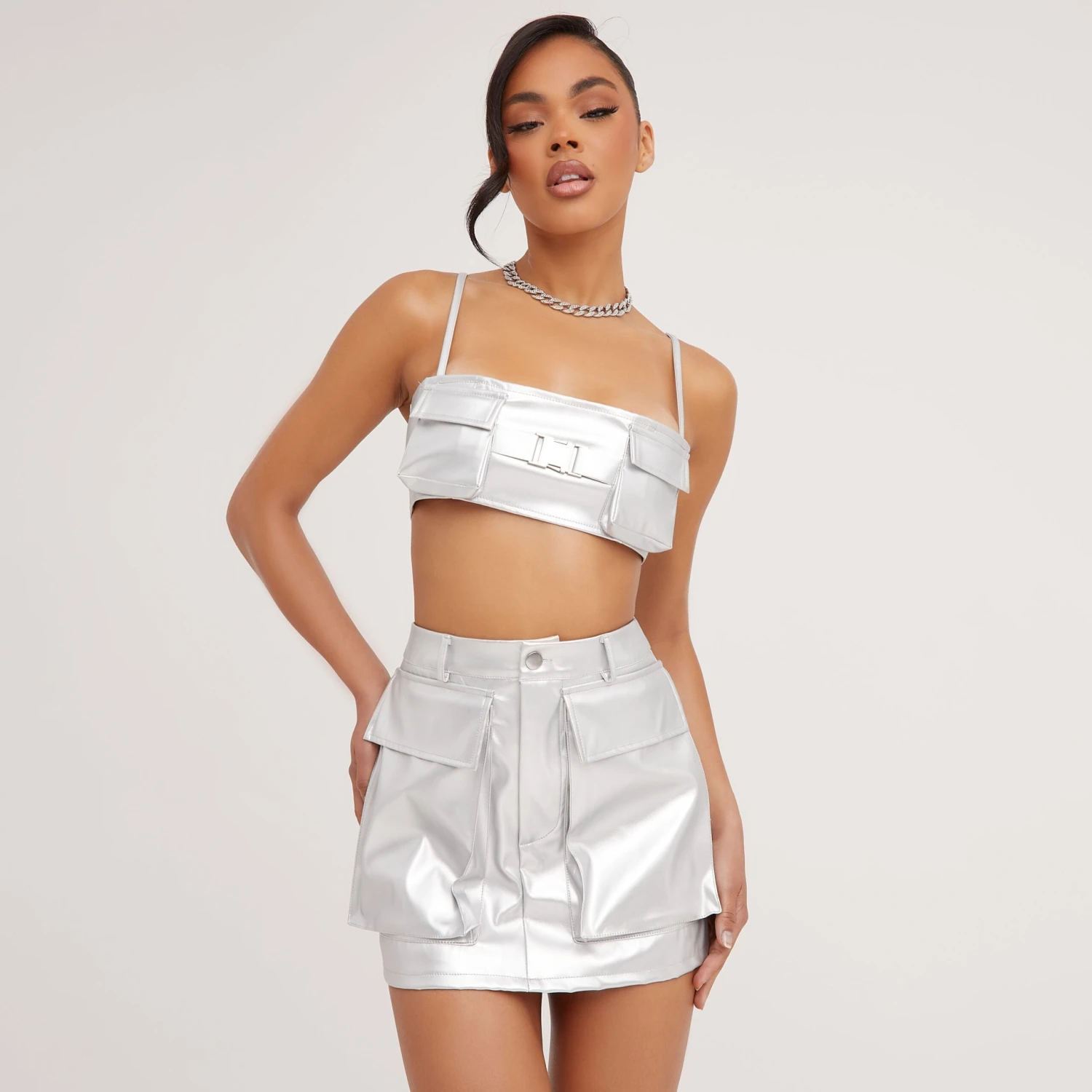 EGO High Waist Pocket Front Detail Mini Bodycon Skirt In Silver Metallic