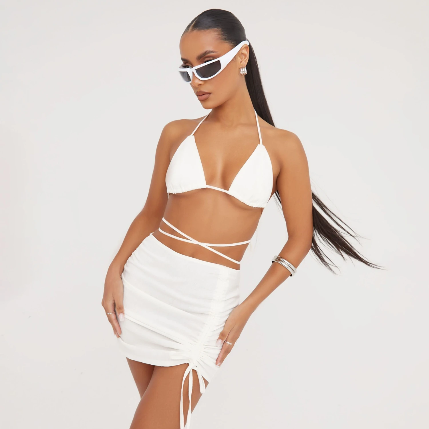 This skirt is at the top of our wishlist girl. Featuring a cream linen material, ruched detailing and a mini length.