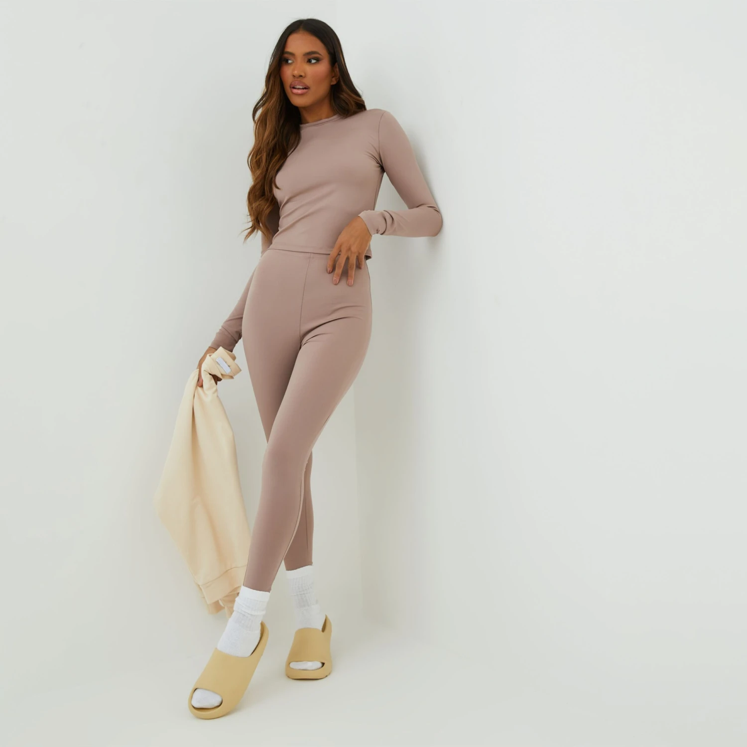 These leggings are perfect for your transitional wardrobe. Featuring a brown stretch material, a high waist and a comfy fit. Team these with the matching top and slides for a casual look we’re obsessed with.