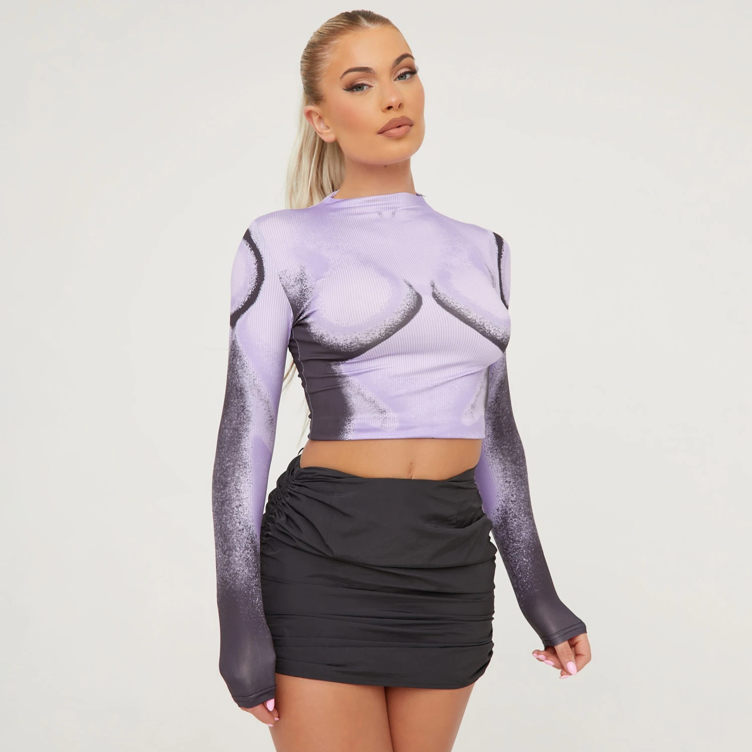Our best seller just dropped in a new colourway and we’re obsessed. Featuring a purple material, a body print design and long sleeves. Team this with a mini skirt and heels for a on point look we love.