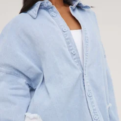 EGO Oversized Curved Hem Distressed Detail Shirt In Blue Denim