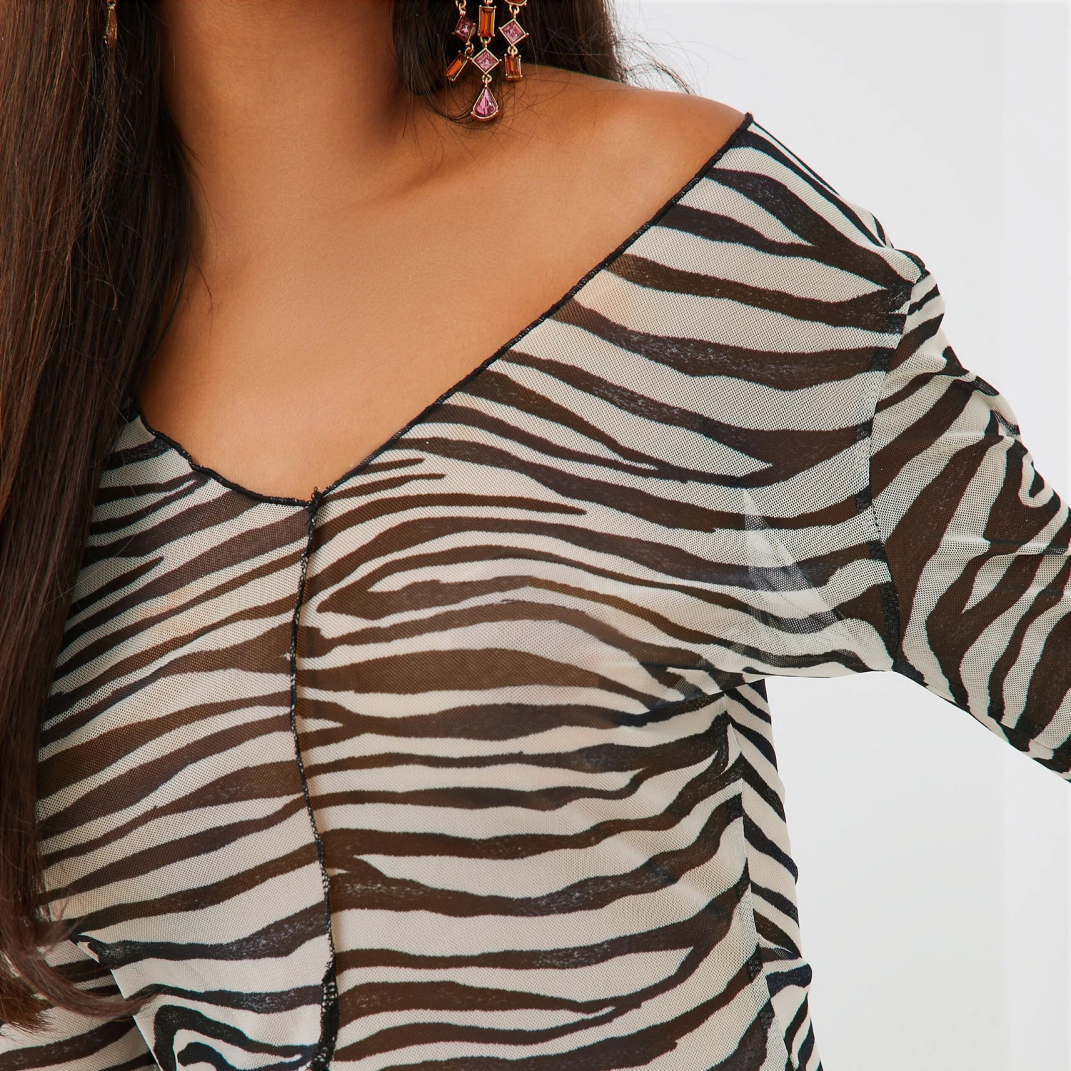 EGO Long Sleeve Split Front Detail Top In Zebra Print Mesh