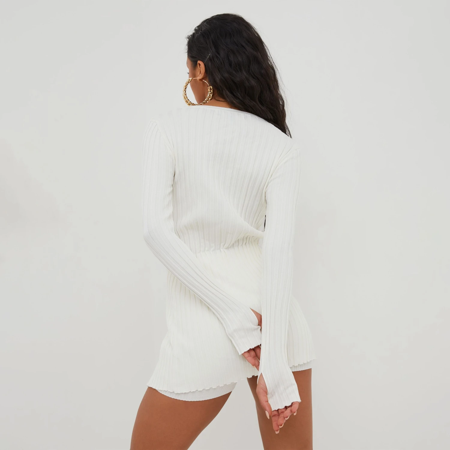 Give your off-duty look a serious update doll. Featuring an ivory ribbed knit material, with button down detailing, long sleeves, a V neck and a cardigan design. Style with the matching shorts for a casual combo.