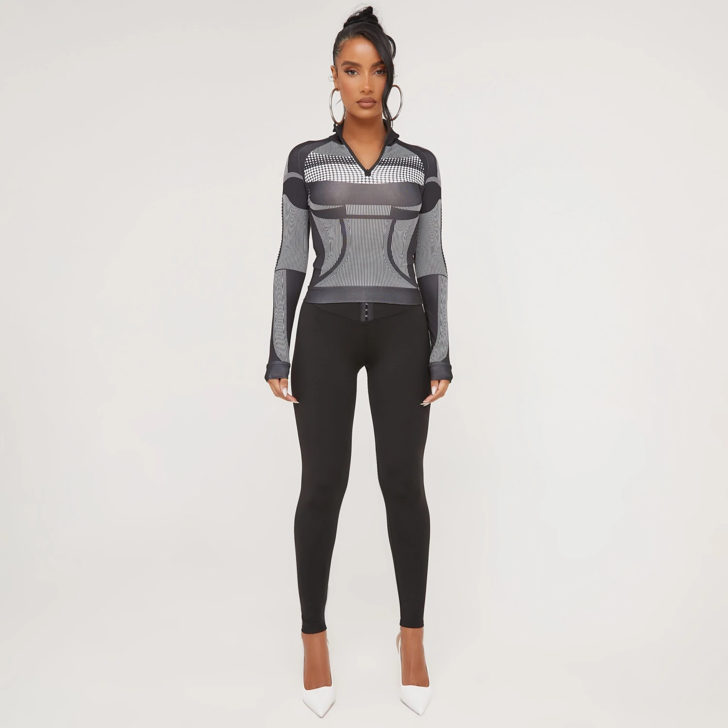 EGO Long Sleeve Zip Front Contour Illusion Detail Top In Black