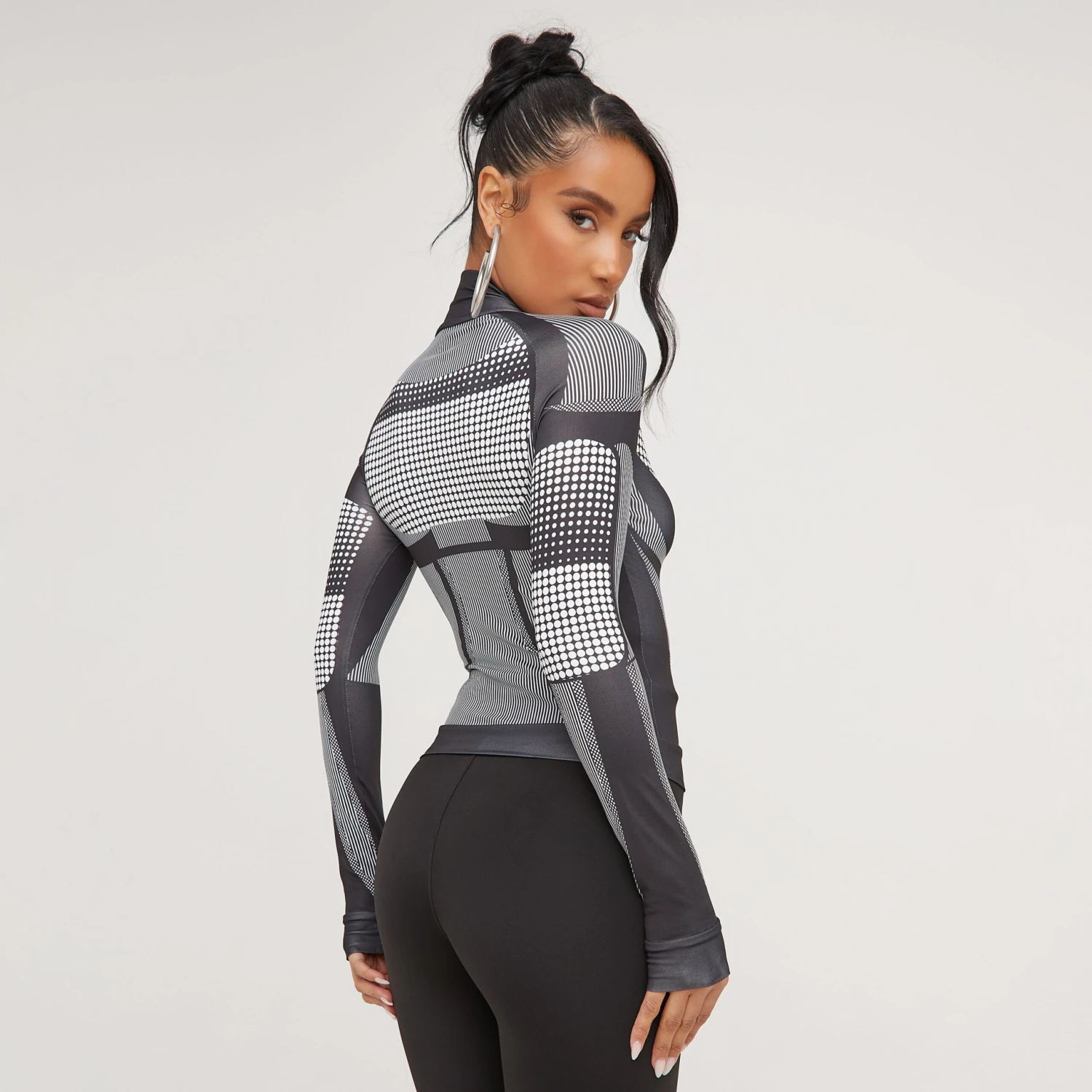 Work some prints into your wardrobe with this top doll. Featuring a black material, a contour illusion print, a zip front and long sleeves. Team this with some leggings and heels for a look we love for day drinkin’ with the dolls.