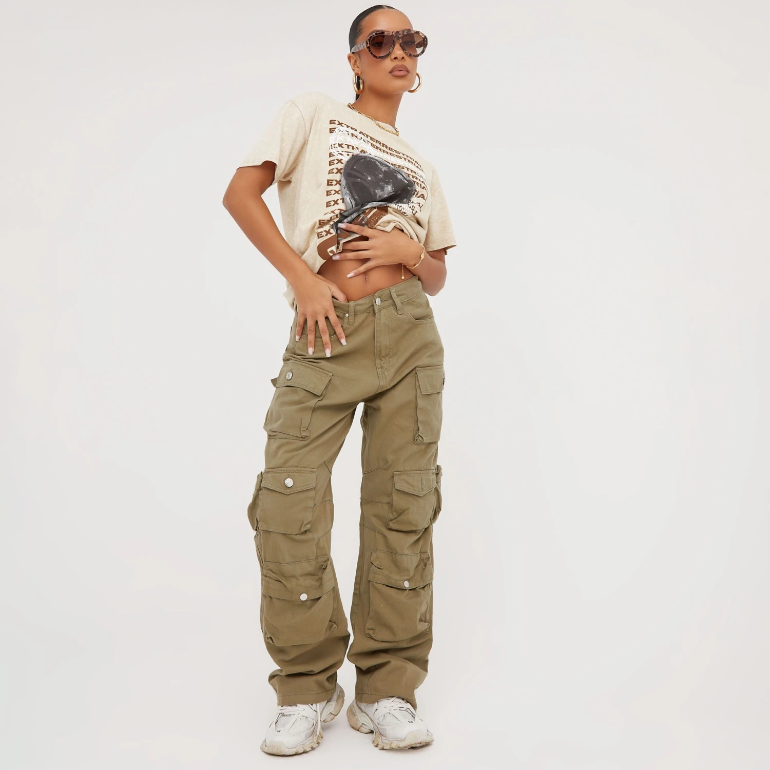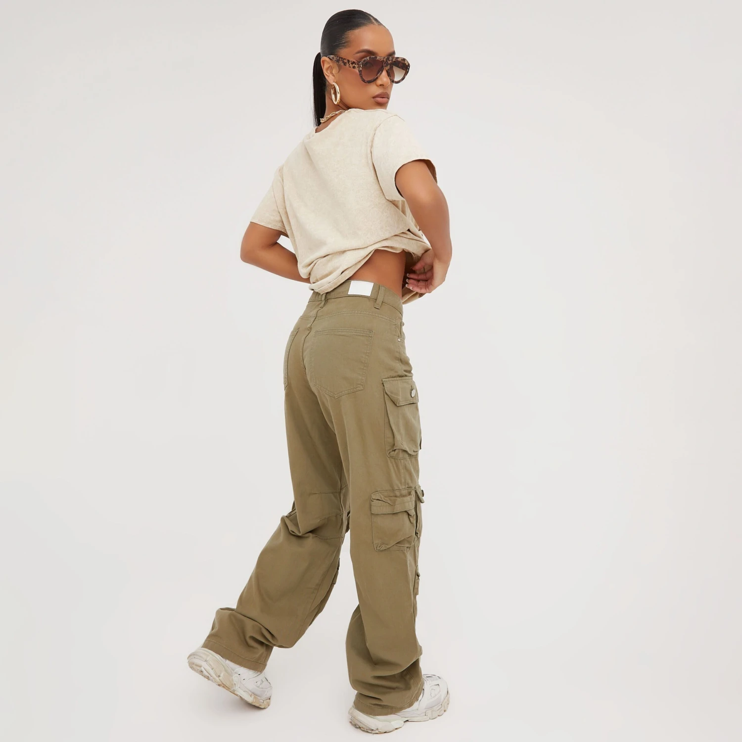 EGO Multi Pocket Detail Straight Leg Cargo Trousers In Khaki Green