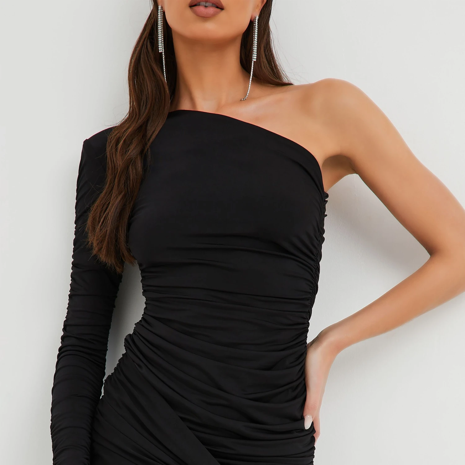 EGO One Shoulder Tie Front Ruched Detail Mini Bodycon Dress In Black Slinky