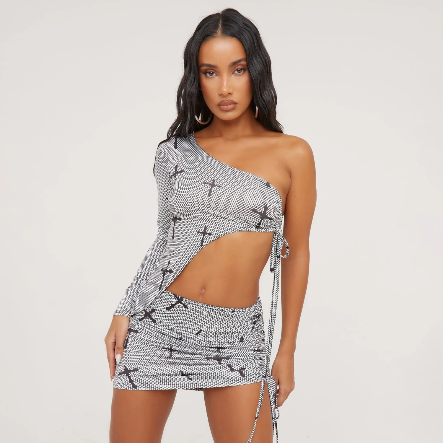 EGO One Sleeve Ruched Detail Cross Print Asymmetric Top And High Waist Mini Bodycon Skirt Co-Ord Set In Black