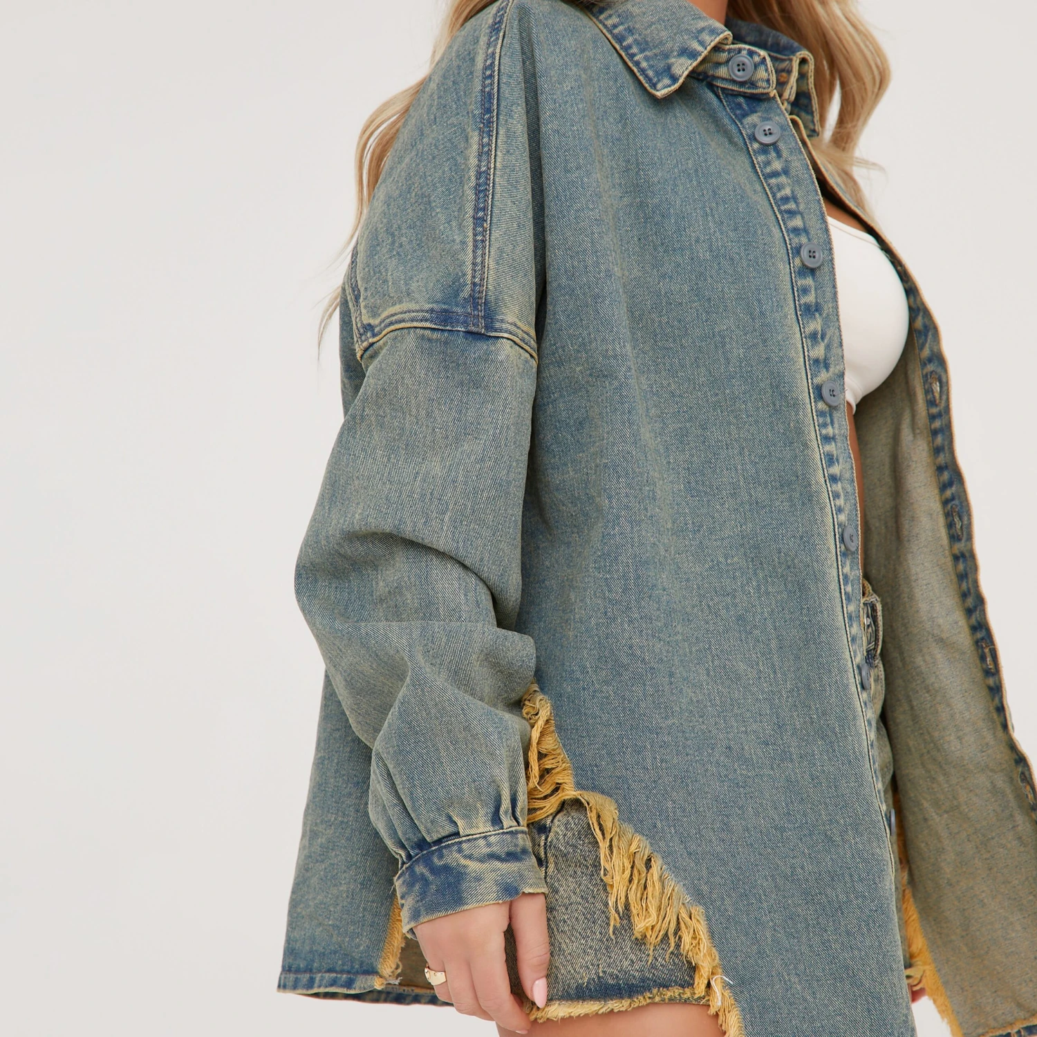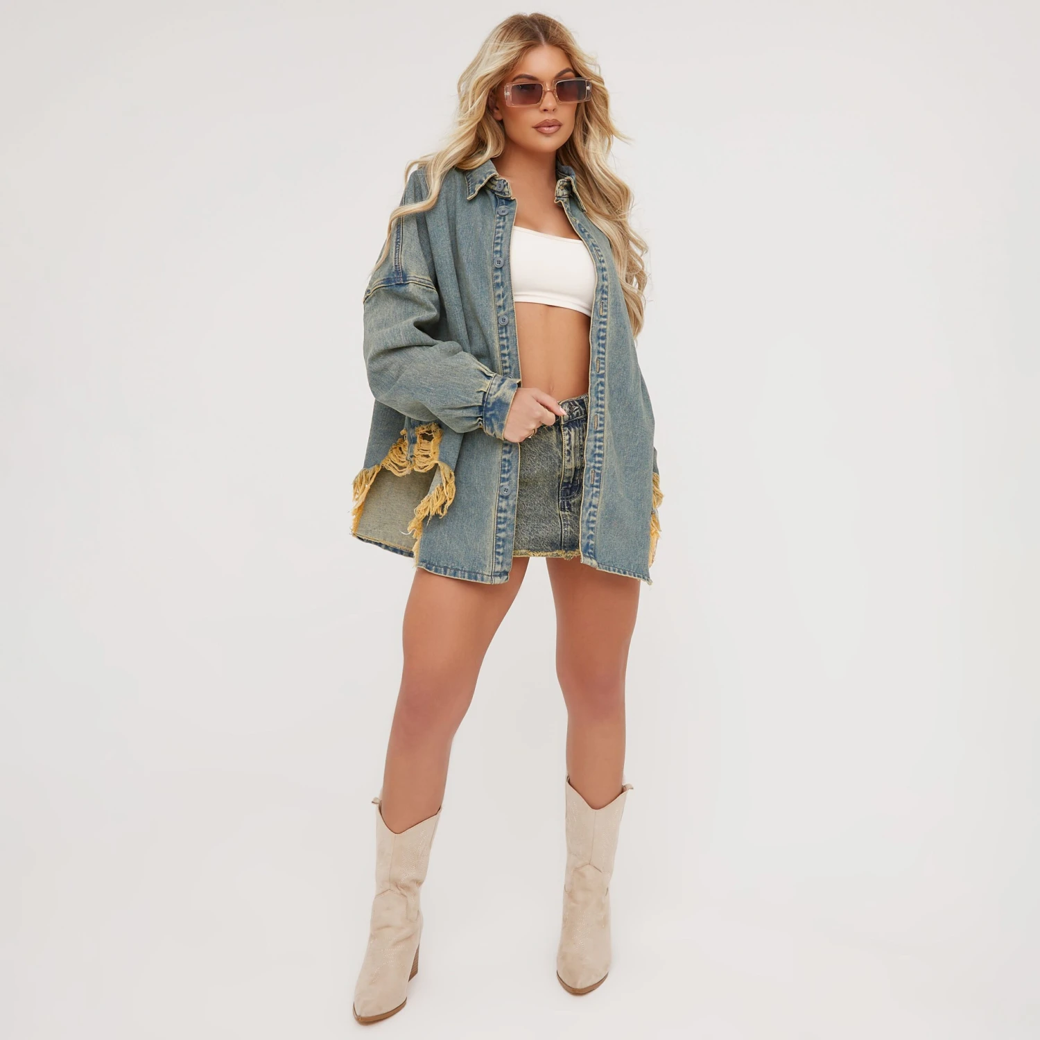 EGO Oversized Curved Hem Distressed Detail Shirt In Blue Dirty Wash Denim