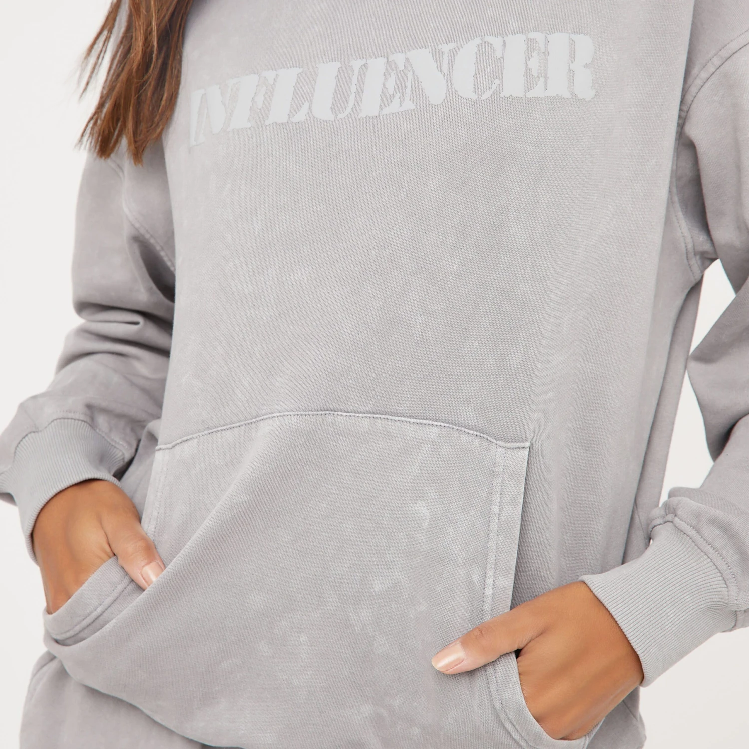 EGO Oversized ‘Influencer’ Slogan Printed Hoodie In Acid Wash Light Grey