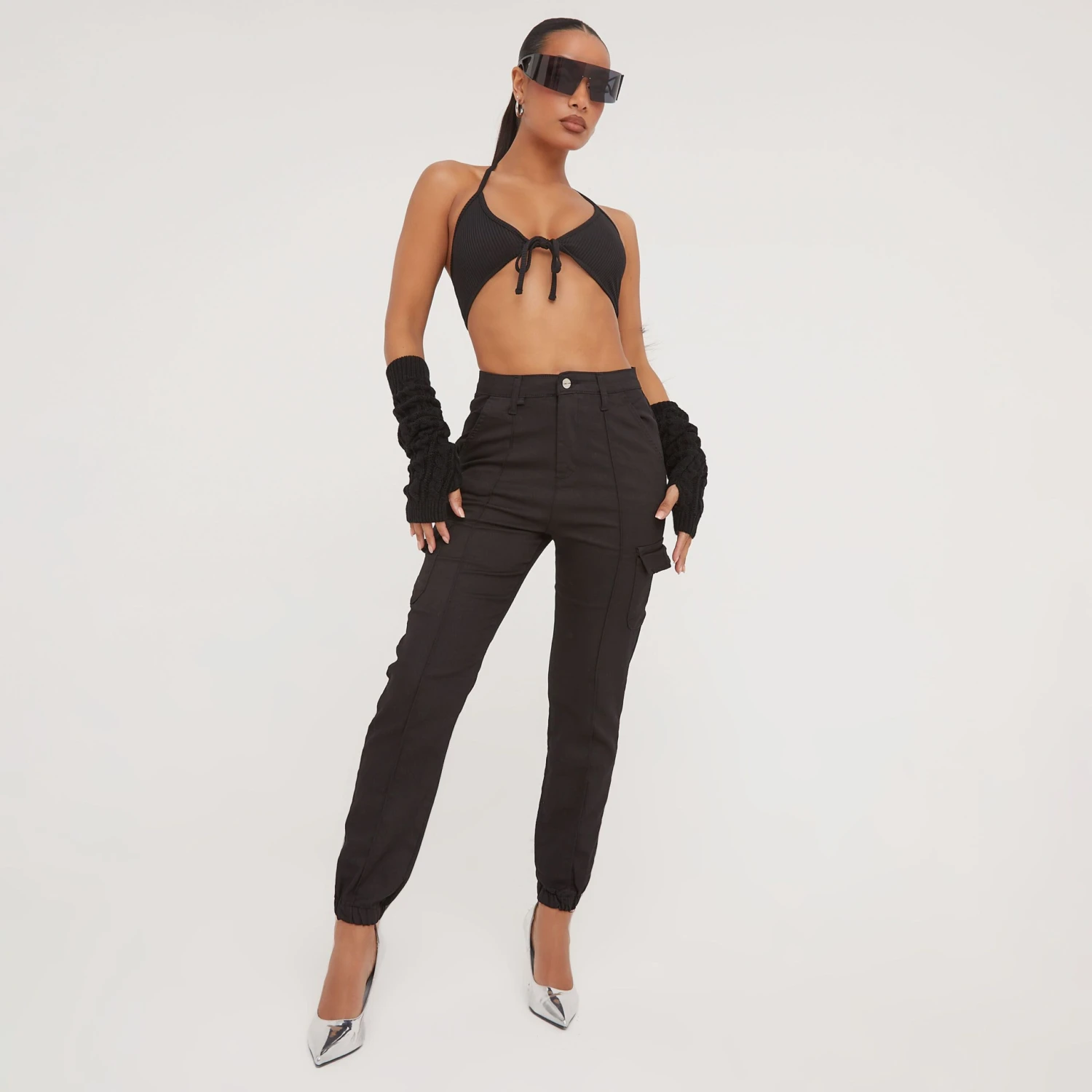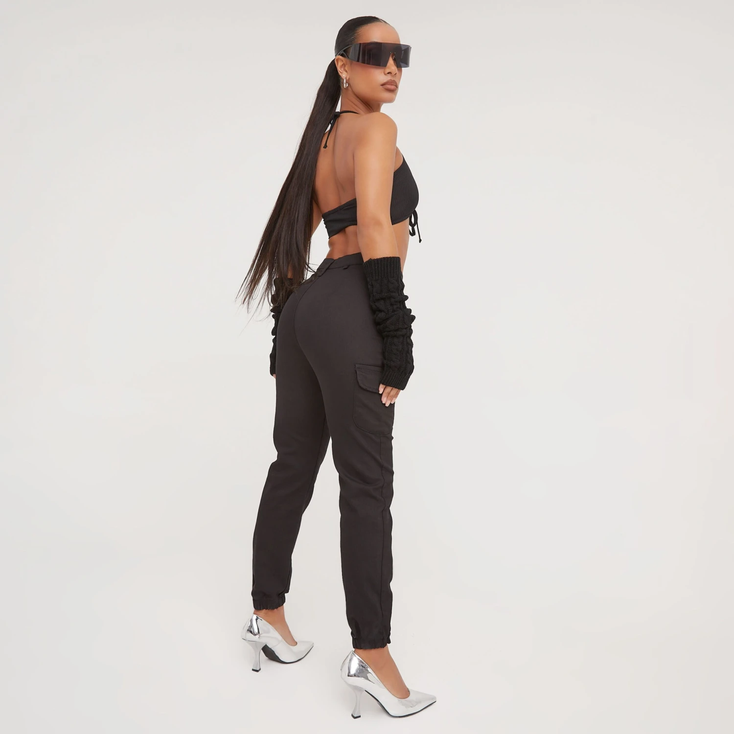 Girl, you need these top trending trousers before they sell out. Featuring a black material, with cargo pocket detailing, a high waist design and a cuffed hem.