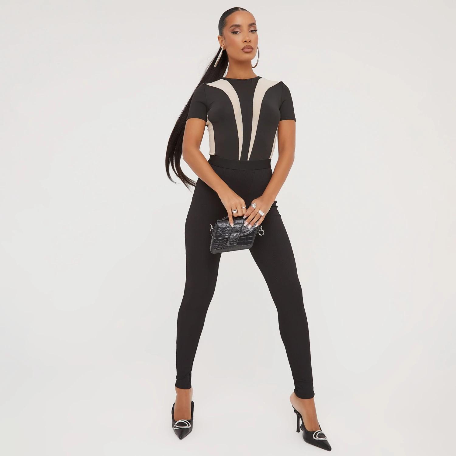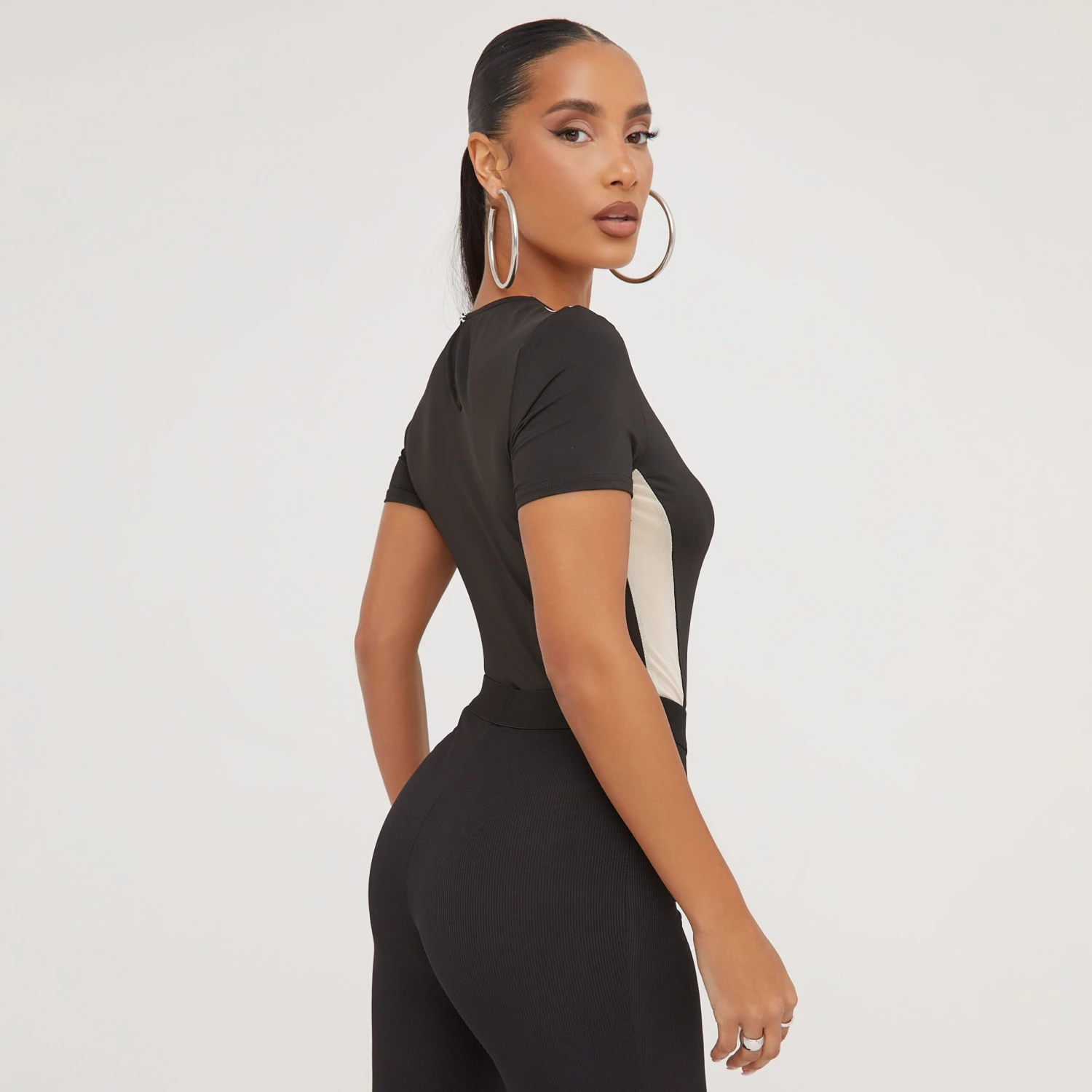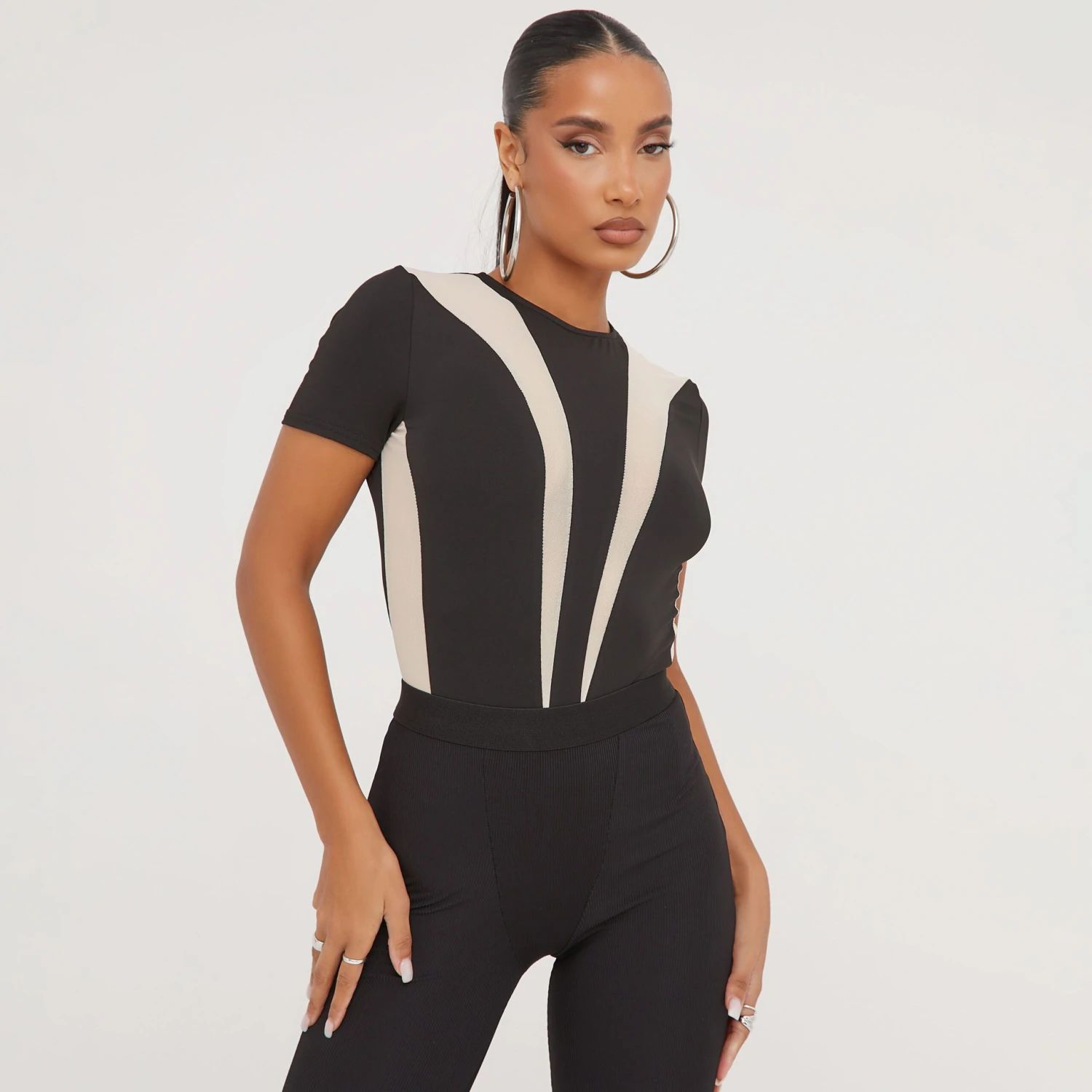 EGO Short Sleeve Mesh Panel Detail Bodysuit In Black Slinky