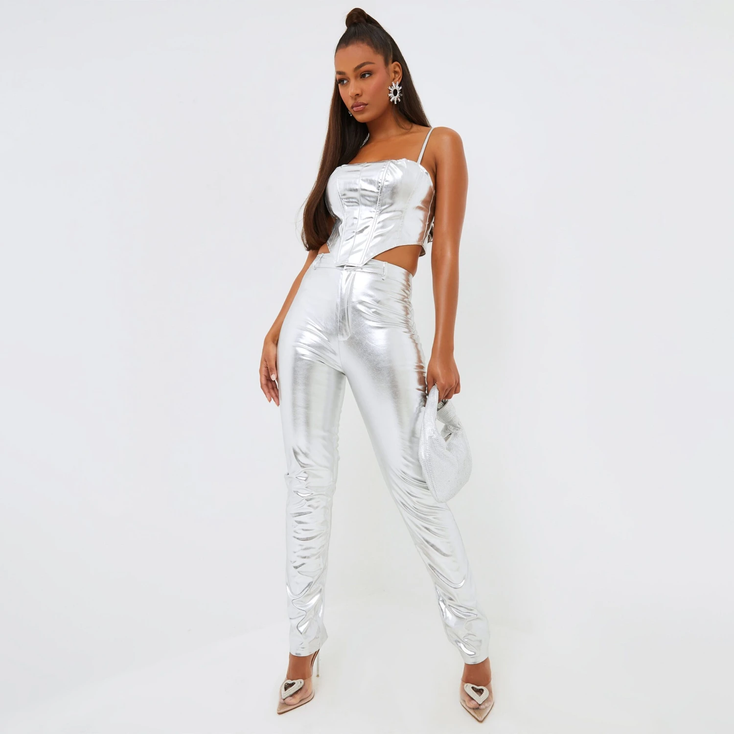 Take your weekend outfit to the next level with this corset doll. Featuring a metallic silver material, panel detailing and a corset fit. Team this with the matching hue bottoms and heels for a party look we’re loving.
