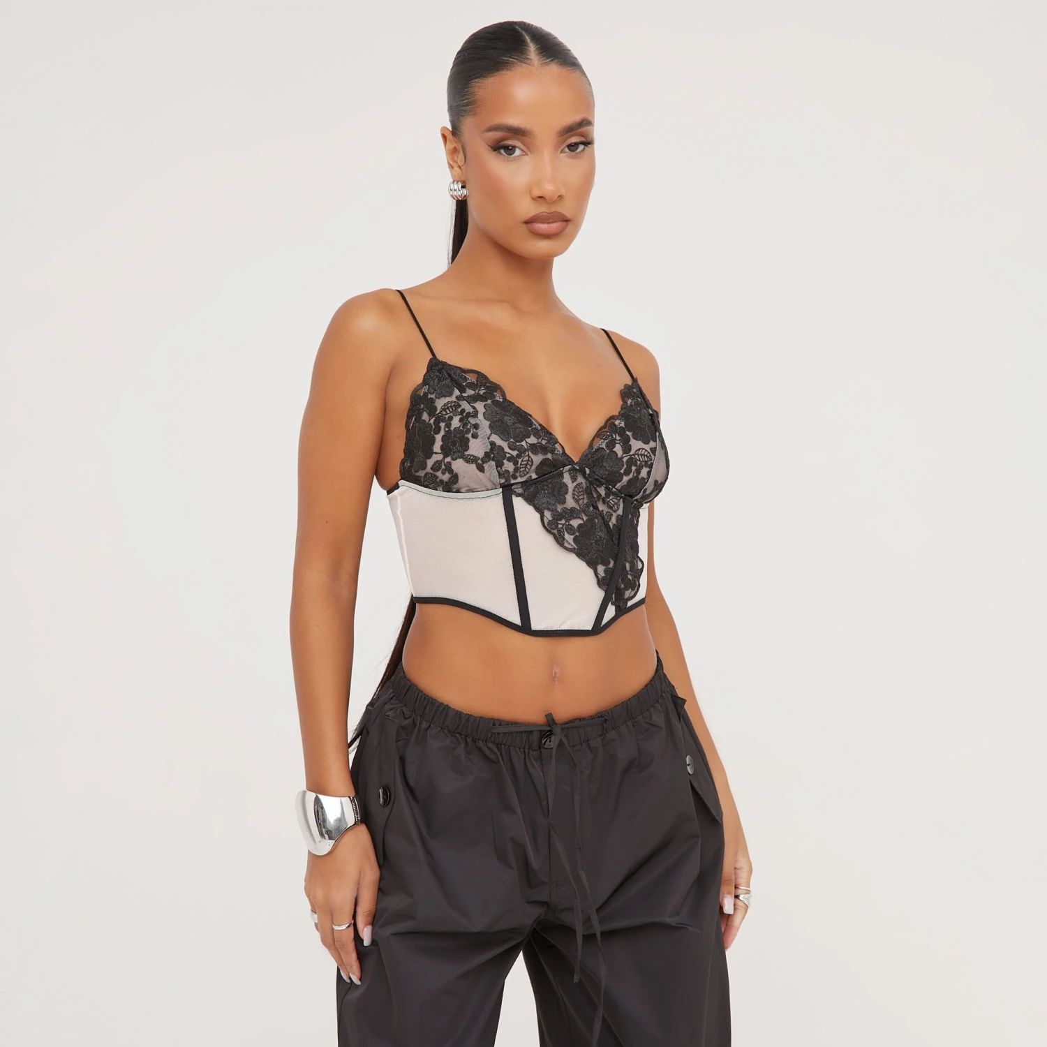 EGO Strappy Mesh Insert Lace Detail Structured Corset Top In Black
