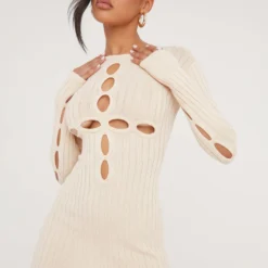EGO Long Sleeve Cut Out Cross Detail Mini Bodycon Dress In Stone Knit