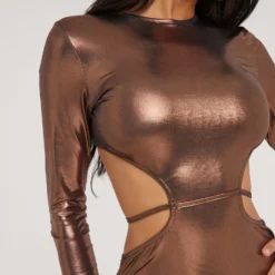 EGO Long Sleeve Cut Out Back Strappy Detail Mini Bodycon Dress In Bronze Metallic