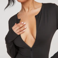 EGO Long Sleeve Zip Up Detail Super Stretch Mini Bodycon Dress In Black
