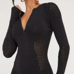EGO Long Sleeve Zip Front Contour Detail Mini Dress In Black Knit