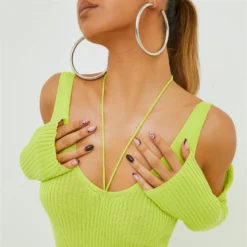 EGO Long Sleeve Strappy Detail Front Split Midi Bodycon Dress In Lime Green Ribbed Knit