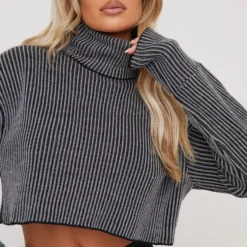 EGO Long Sleeve Roll Neck Oversized Cropped Jumper In Black And Charcoal Contrast Ribbed